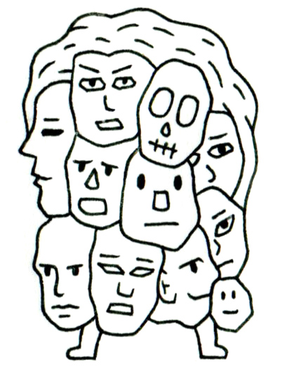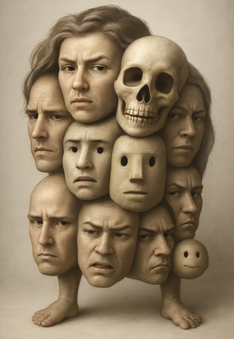 一つの身体に複数の顔が密集し、統一された人格を持たぬまま歩き出そうとする姿は、現代社会における個の分裂と他者との同一化を象徴している。それぞれの顔は異なる感情や表情を湛え、仮面、頭蓋骨、単純化された笑顔など多様な質感をまとっている。