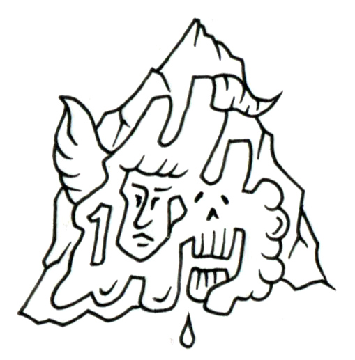 空に浮かぶ山塊の一部が溶解し、二つの顔をあらわにしている。左には静謐な人の顔が、右には空洞の骸骨が浮かび、その境界は滑らかな融解の流れによって曖昧に溶け合っている。翼や角といった異質なパーツは、それぞれの顔が象徴する異なる次元——生と死、希望と暴力、記憶と忘却——の暗示として添えられている。